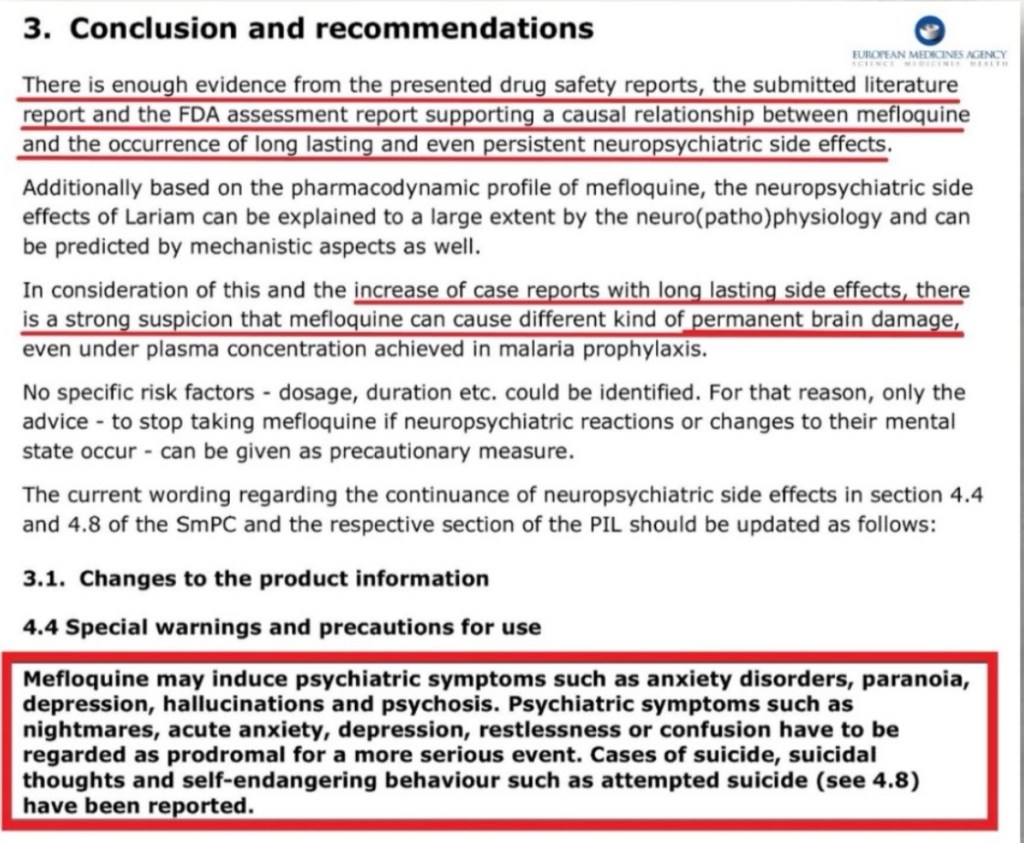 The 2014 European Medicines Agency (EMA) Pharmacovigilance Risk Assessment Committee (PRAC) concluded there is enough evidence from safety reports, submitted literature, and the FDA to support a causal link between Lariam and long-lasting, even permanent, neuropsychiatric harm. Rising case reports only strengthen the suspicion of permanent brain injury.