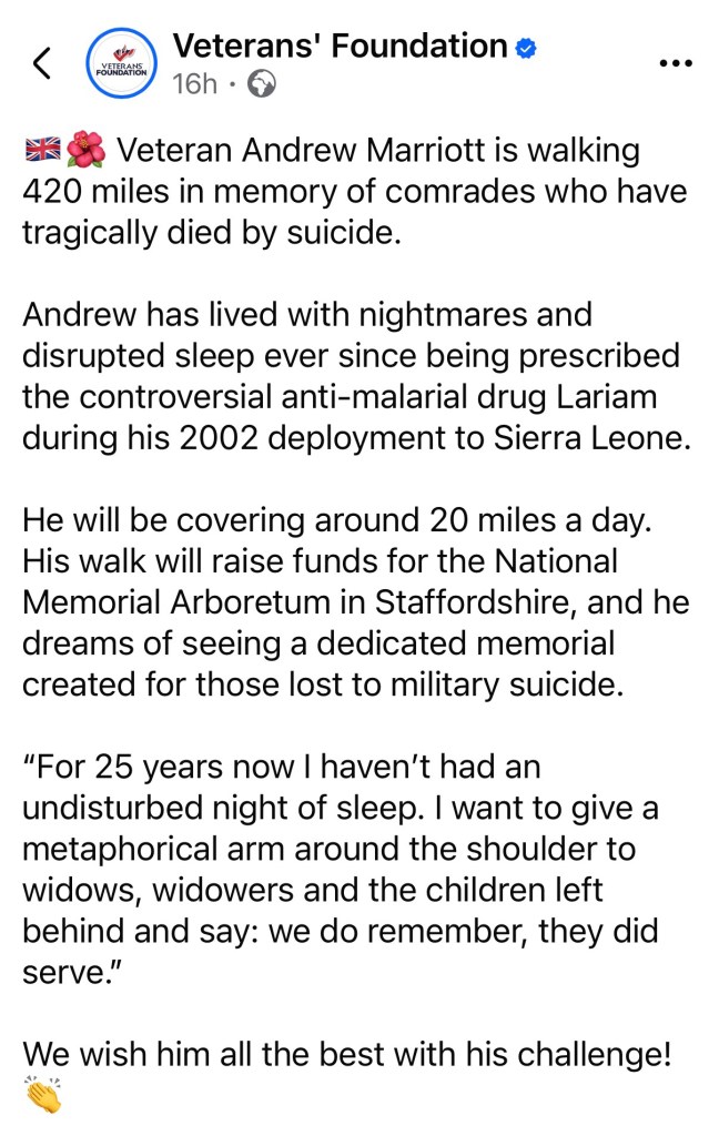 With just 100 miles remaining in the journey, every step continues to honour veterans affected by #MilitarySuicide and especially those harmed by Mefloquine (Lariam).